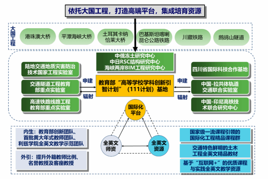 依托“中外合作办学”项目打造国际化培养环境,推动学院国际化内涵式发展。通过汲取并创新教育理念、提升师资队伍国际化水平、创建高端国际化平台、深化合作拓展国际教育资源、完善国际化服务体系,为创建一流国际化学院奠定坚实基础。建成教育部“岩土与地下工程智能建造与安全”学科创新引智基地、科技部“中国-印尼高铁技术联合研究中心”和“重大交通土建工程智能建造与运维”四川省国际科技合作基地。近几年来,与全球10多个国家知名高校/机构共签订30余项联合培养项目;大批优秀毕业生投身“一带一路”建设。创办国际学术期刊2本,主办大型国际学术会议15场。学科全球排名大幅提升。