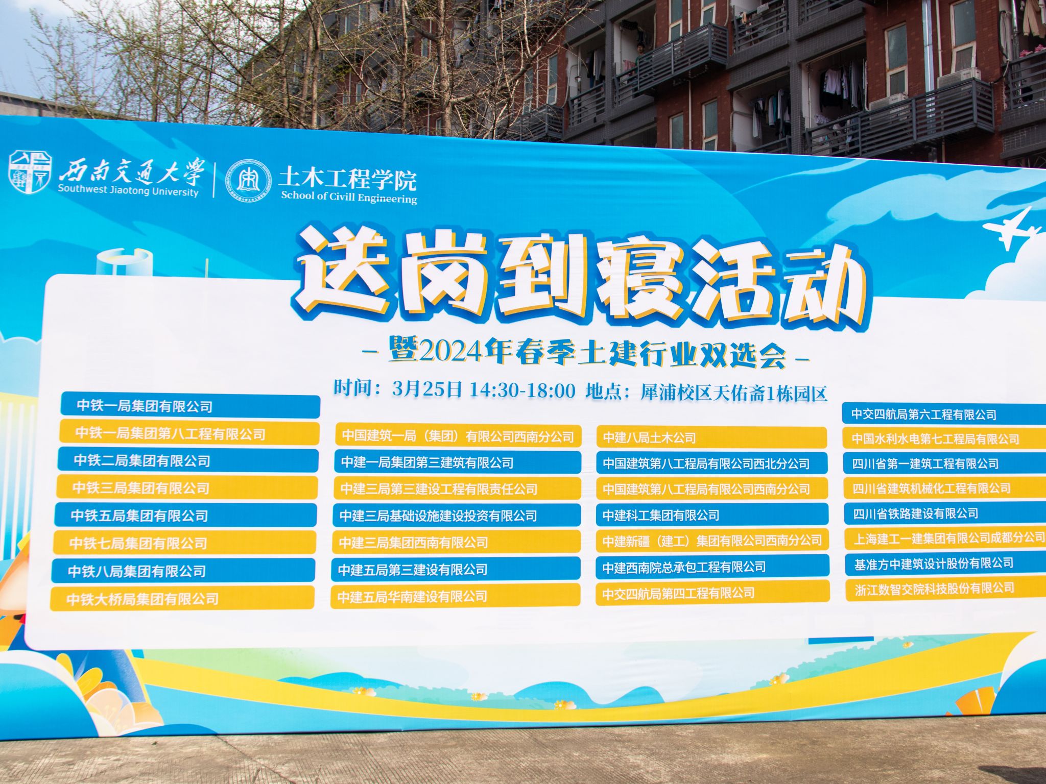 为深入贯彻落实党的二十大精神,落实党中央、国务院“稳就业”“保就业”决策部署,促进毕业生更高质量更加充分就业,芒果视频 于2024年3月25日下午在犀浦校区天佑斋1栋学生宿舍园区成功举办了一场别开生面的“送岗到寝”活动2024年春季土建行业双选会。