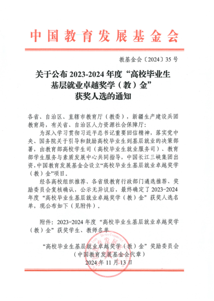 “高校毕业生基层就业卓越奖学金”由教育部高校学生司(高校毕业生就业服务司)、教育部学生服务与素质发展中心共同指导,中国长江三峡集团有限公司出资,中国教育发展基金会特设,旨在深入学习习近平总书记重要回信精神,贯彻落实党中央、国务院关于引导和鼓励高校毕业生到基层就业的决策部署,奖励赴基层就业创业并做出突出业绩的普通高校毕业生。2024年,全国共有398名优秀高校毕业生获得奖励。此次芒果视频
