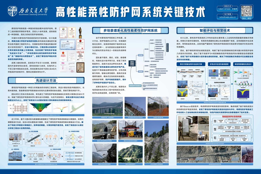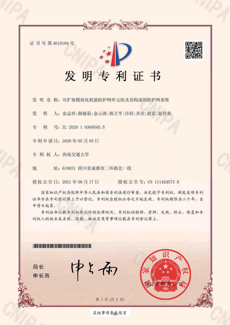 “可扩展模块化耗能防护网单元组及其构成的防护网系统”提供了一种模块化单元式分布耗能被动防护网系统及安装方法,具有变形路径短、耗能效率高、锚固点少、独立分布式耗能、可独立拆装等特点,可解决现有被动柔性防护系统支撑绳锚固点施工难度大、工作量大、柱间防护单元无法独立工作及独立更换、防护系统无法任意扩展的问题,兼具较高的经济性、易恢复性和可扩展性。该专利还曾荣获2022年度四川专利奖创新创业奖。