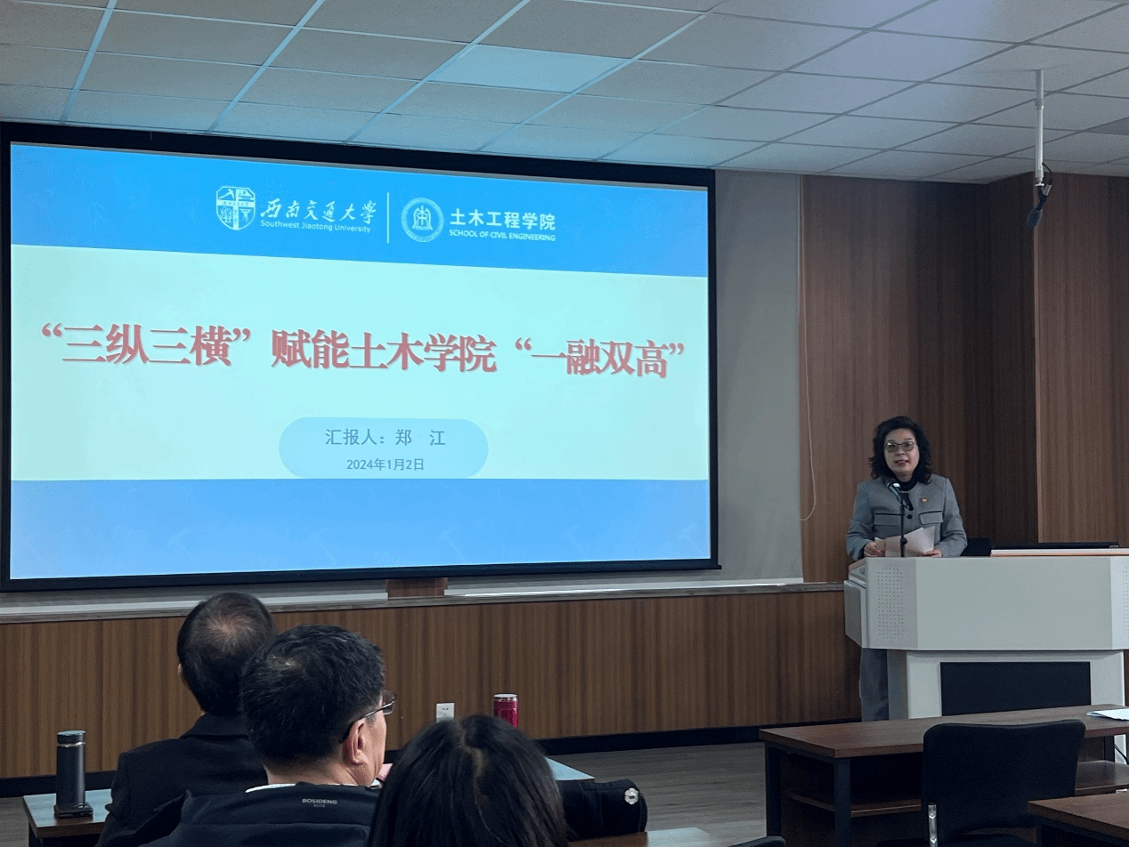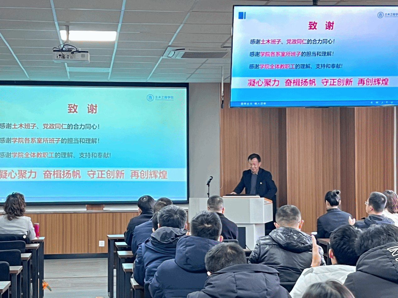 郑江书记作学院党建工作报告。郑书记以“三纵三横”赋能土木学院“一融双高”为主题,从“突出政治引领,强化理论武装”“突出提质增效,强化组织功能”“突出‘一融双高’,赋能高质量发展”“落实主体责任,强化责任担当”“存在问题及下一步工作思考”五个方面对学院党建工作进行了总结报告。