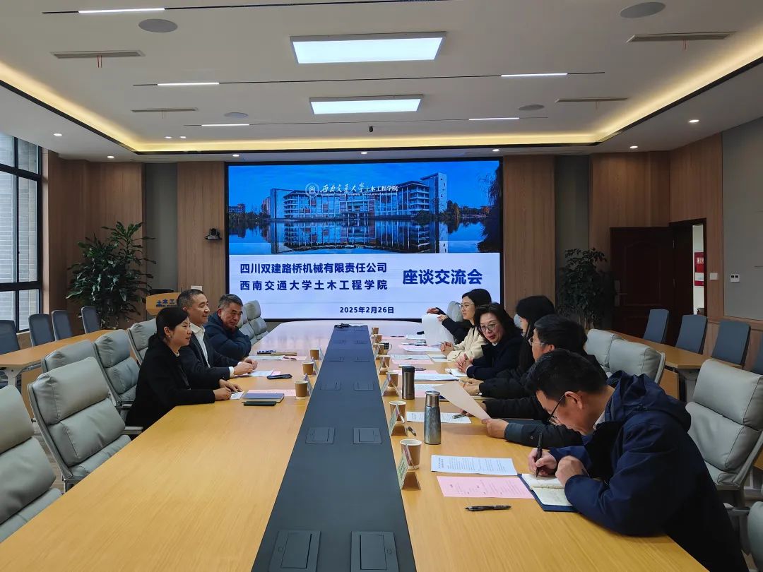 与四川双建路桥机械有限责任公司在犀浦校区X4417A会议室开展座谈交流会。成都市铸造行业协会会长、四川双建路桥机械有限责任公司董事长张建祥、总经理章文、副总经理骆云秀,学院党委书记郑江、党委副书记刘萍、副院长于丽,陆地交通地质灾害防治技术国家工程研究中心副主任庄卫林、科教部部长洪彧及王武斌老师等出席会议。会议由庄卫林主持。