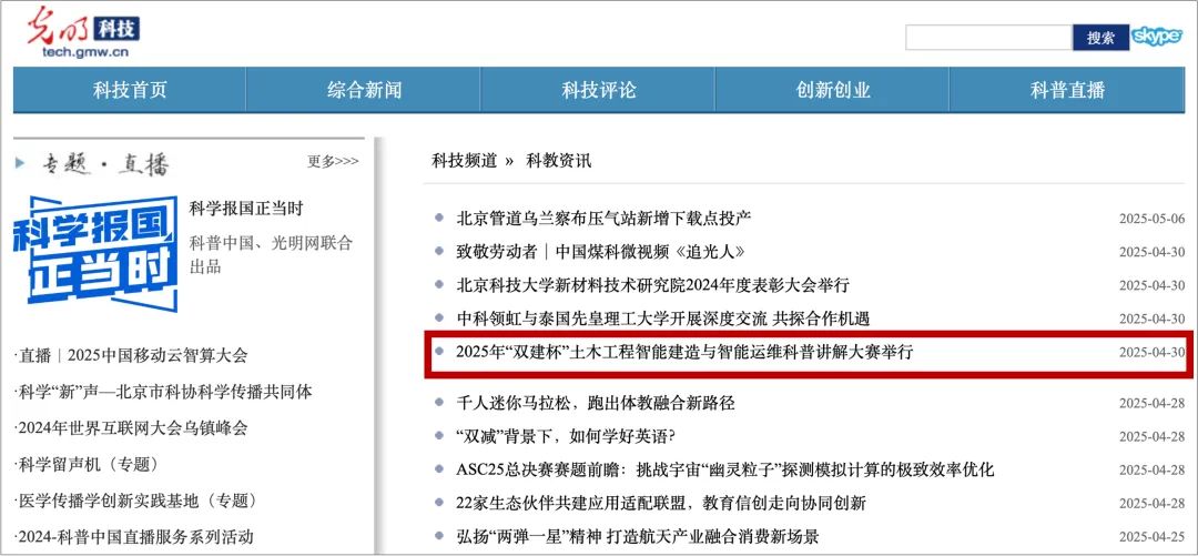 4月30日,光明网科技频道科教资讯栏目报道我校2025年“双建杯”土木工程智能建造与智能运维科普讲解大赛!