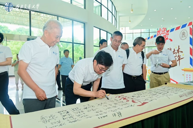 5日中午,就有专程从吉林赶来的校友,第一个到会场签到。校友们陆续在“百年土木”画轴上签名,并领取印有个人名字的胸牌,学院还为返校校友制作土木文创折扇与毡包。在照片墙前,校友们热切合影打卡。