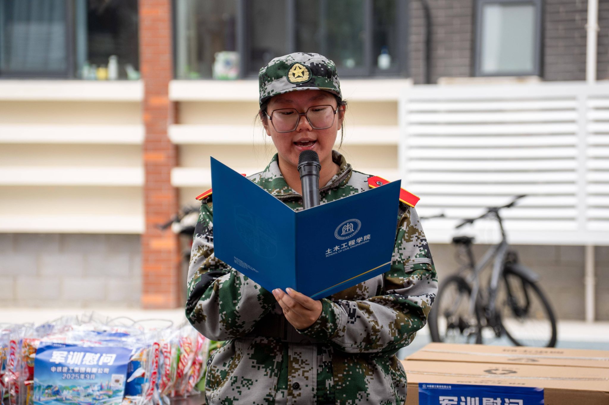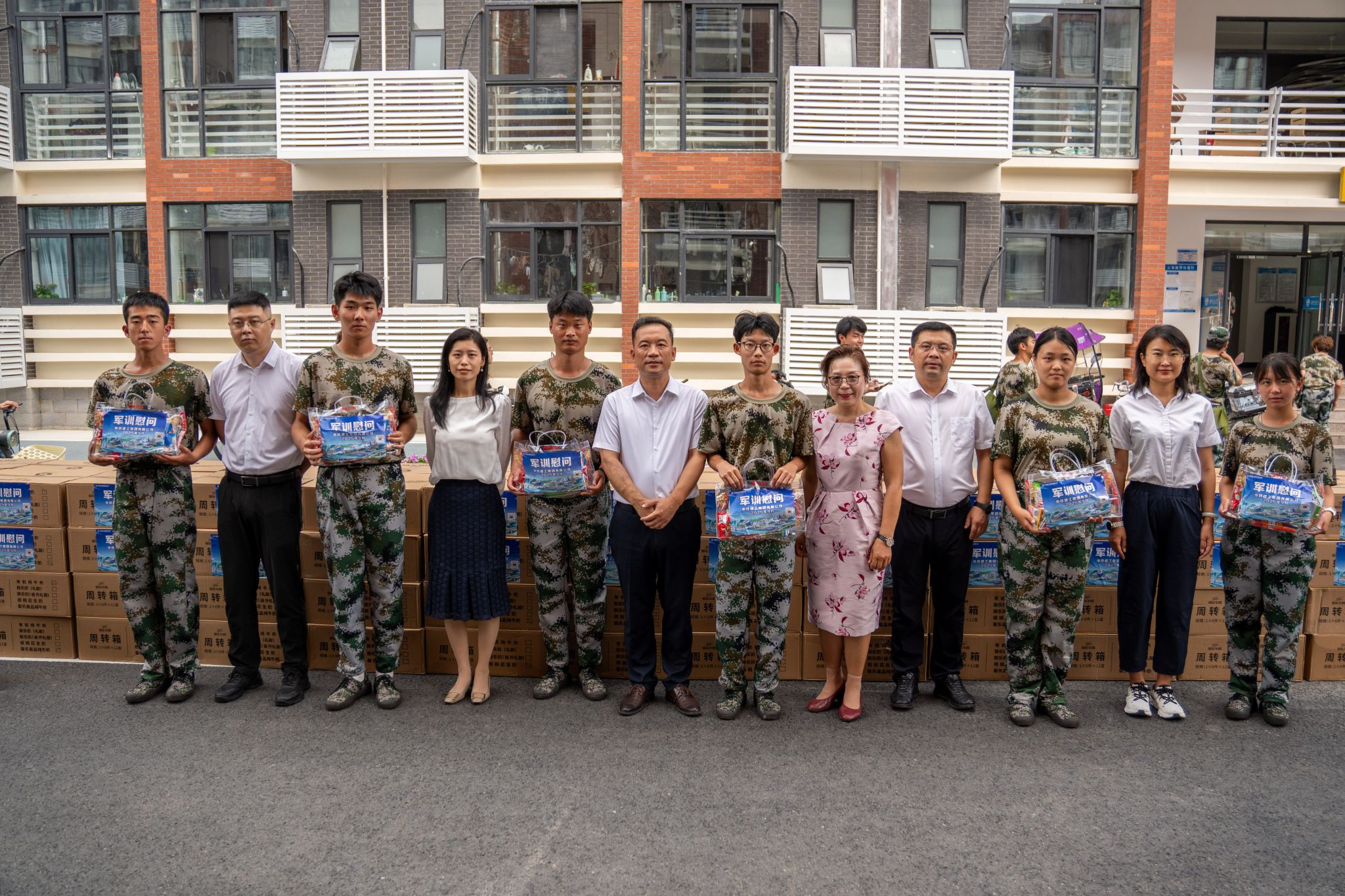 仪式最后,学院与企业领导共同为新生发放了精心准备的零食礼包,既考虑到了同学们训练中的体能补充,也兼顾了健康与营养。领导们亲手将礼包递到学生手中,并亲切询问训练情况,叮嘱大家注意身体。新生们接过满载关爱的礼包,脸上洋溢着惊喜与感动,纷纷表示这份关怀来得及时又暖心。小小的礼包不仅为训练间隙补充了能量,更传递出学院与企业对新生的深切爱护与支持,进一步激发了大家完成军训任务的信心与动力。