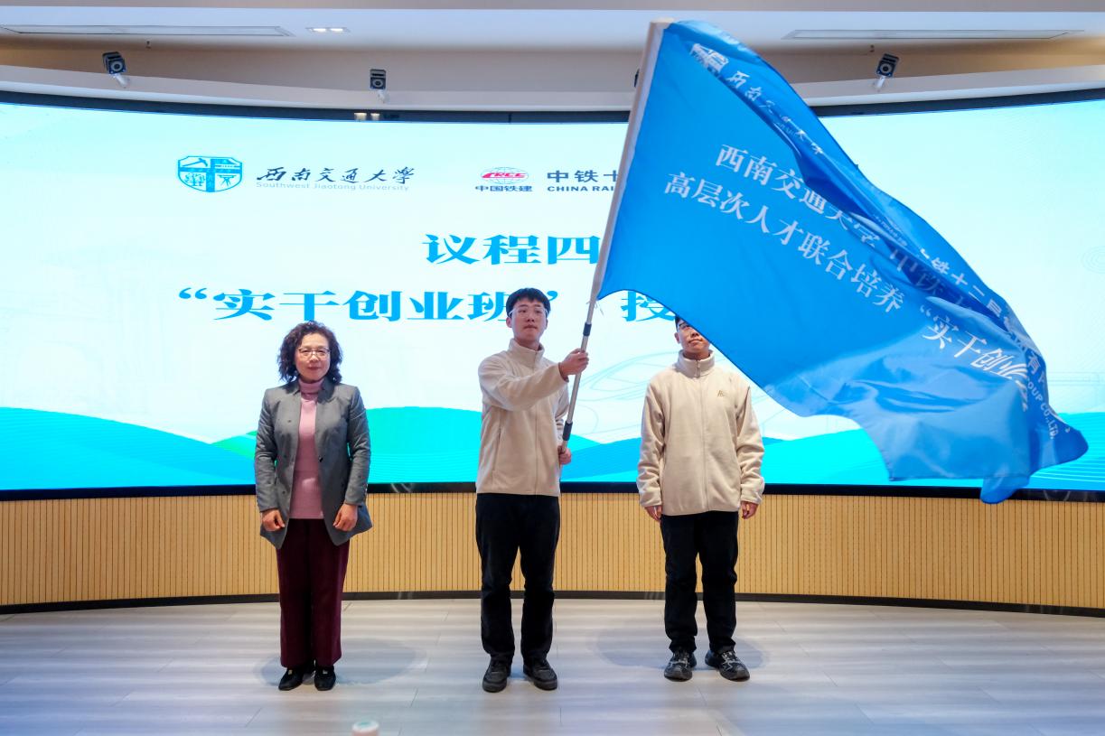党委书记郑江郑重地将“实干创业班”班旗授予班级代表。