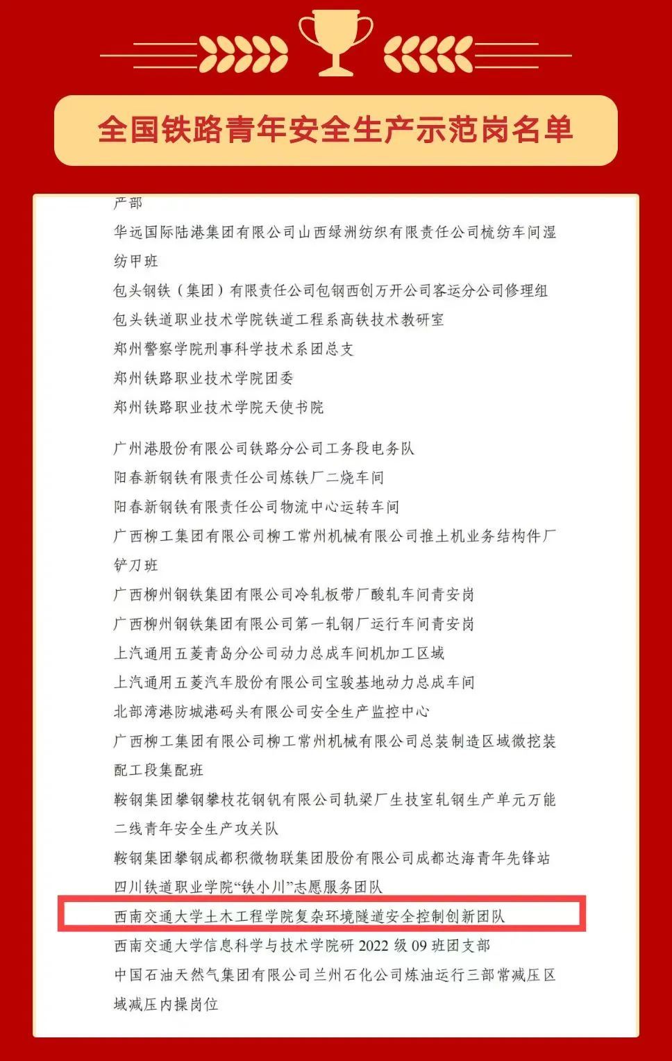 树立典型,激励奋进,进一步促进青年成长成才,经全国铁道团委评审决定,芒果视频 复杂环境隧道安全控制创新团队荣获“全国铁路青年安全生产示范岗”。
