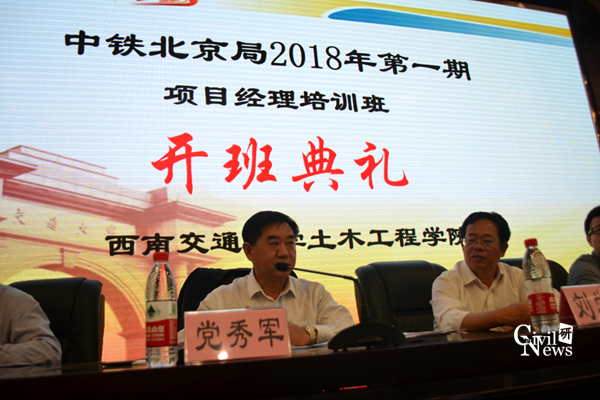 紧接着是中铁北京局党委副书记、纪委书记党秀军致辞,党秀军书记首先肯定了西南交大在工程人技术才培养方面的卓越贡献并对中铁北京局的概况以及近年来的发展情况做了介绍。党委书记指出,随着北京局的快速发展,公司规模与人力资源紧张的矛盾愈发突出。此次培训班的开办是提升人才综合素质的需要,也是提升项目精细化管理水平的需要,同时也有利于相互之间的交流学习。党委书记对八天的培训过程提出了具体的要求,并希望各位项目经理珍惜机会学有所成。